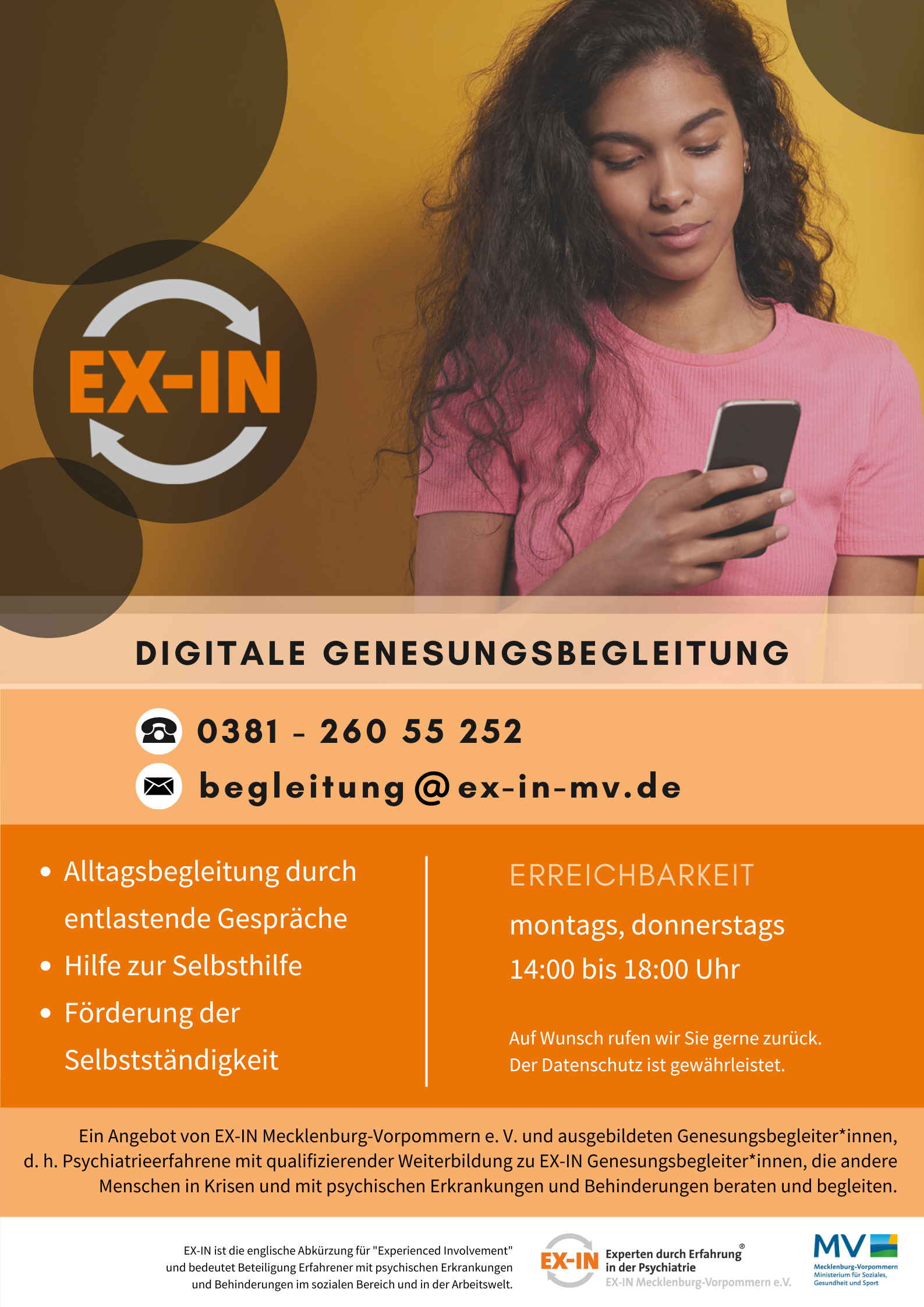 Seit 2021 entwickelt der Verein EX-IN M-V über das Modellprojekt „Digitale Genesungsbegleitung“ eine neue Form des Peer-Supports bzw. der Peer-Beratung für Menschen in psychischen Belastungssituationen. Dieses Projekt geht hervor aus der „Telefonischen Genesungsbegleitung“ und wurde seit dem um mehrere digitale Kommunikationskanäle erweitert. Wir möchten auf diesem Wege auf Augenhöhe informieren, Verständnishürden abbauen und beim Finden individueller Wege aus einer schwierigen Situation unterstützen.