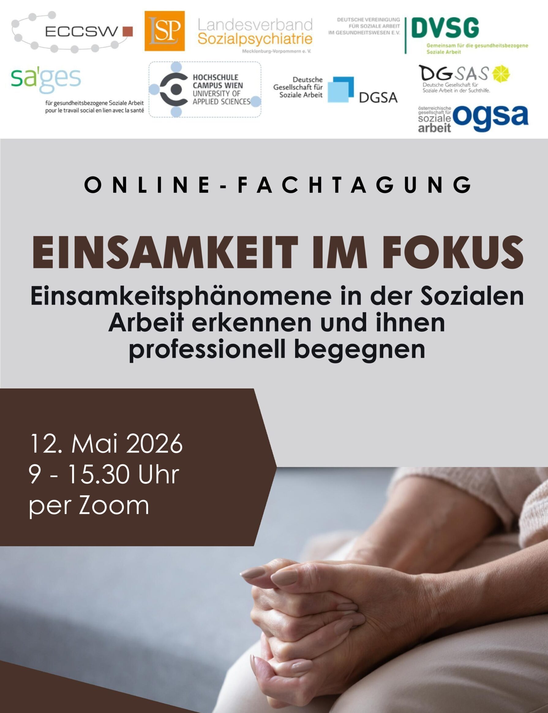 Daher lädt das European Centre for Clinical Social Work e.V. (ECCSW) am 12. Mai 2026 unter dem Motto „Einsamkeit im Fokus – Einsamkeitsphänomene in der Sozialen Arbeit erkennen und ihnen professionell begegnen“ zu einer kostenfreien Onlinefachtagung ein. Dabei sollen die gesundheitlichen Auswirkungen von Einsamkeit in der Bevölkerung und bei verschiedenen Zielgruppen der Sozialen Arbeit im Fokus stehen. Gleichzeitig werden Strategien und Interventionsformen aufgezeigt, um Einsamkeitsphänomene rechtzeitig zu erkennen und ihnen professionell zu begegnen. Die Fachtagung findet in Kooperation mit der Hochschule Campus Wien, dem Landesverband Sozialpsychiatrie Mecklenburg-Vorpommern e.V., der Österreichischen Gesellschaft für Soziale Arbeit, der Deutschen Vereinigung für Soziale Arbeit in der Suchthilfe e.V., der Deutschen Vereinigung für Soziale Arbeit im Gesundheitswesen e.V., dem Schweizerischen Fachverband für gesundheitsbezogene Soziale Arbeit und der Deutschen Gesellschaft für Soziale Arbeit e.V. statt.